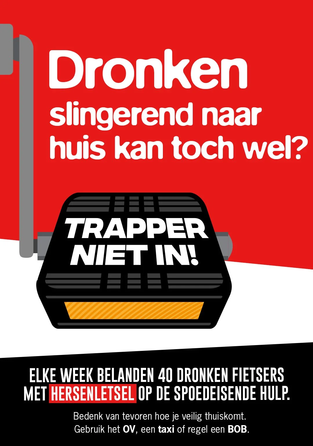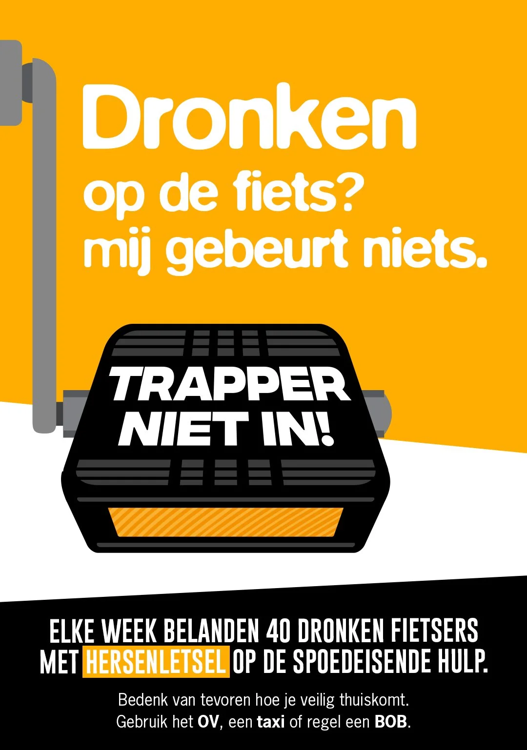 Ben jij van plan om dronken op de fiets te stappen na een avondje uit? Trapper niet in! Want in Nederland belanden wekelijks 40 dronken fietsers met hersenletsel in het ziekenhuis. Uit cijfers van VeiligheidNL blijkt dat het aantal fietsongelukken door fietsen onder invloed van alcohol in de afgelopen 10 jaar met 84 procent is gestegen. Dat vraagt om meer bewustwording. De campagne Trapper niet in! voor de Provincie Utrecht maakt jongvolwassenen bewust van de risico's van fietsen onder invloed van alcohol.